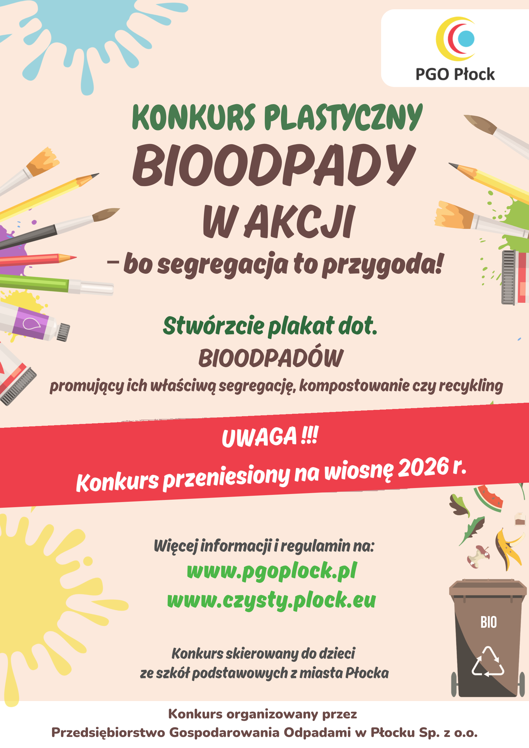 Informujemy, że konkurs plastyczny „Bioodpady w Akcji – bo segregacja to przygoda!” zostaje przeniesiony na wiosnę 2026 roku.